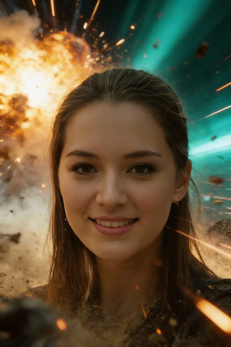 Turn your photo into a high-energy blockbuster frame—cinematic color grade, dynamic motion, sparks and debris, and a just-caught-in-the-action feel.