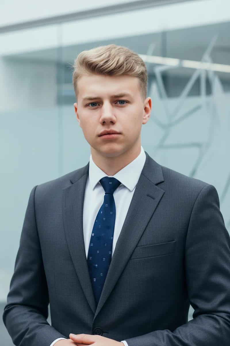 Instil modern confidence. The 'Metro Secure' style places you in a sharp, urban business environment, projecting an image of stability, insight, and polished assurance.